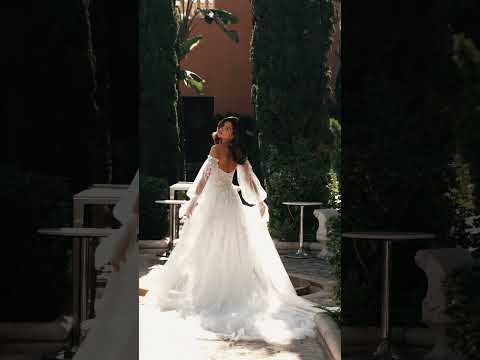 Das Kleid hat lange, abnehmbare, bauschige Tüllärmel , die der Silhouette eine romantische und luftige Note verleihen. Die Ärmel lassen sich abnehmen, um das Outfit im Laufe des Tages zu verändern – von einem majestätischen Look zu einem leichteren, festlicheren Stil.
