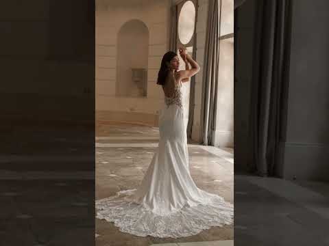 Der taillierte Meerjungfrauenschnitt schmiegt sich perfekt an die Kurven an, während die edlen Materialien – Stretch-Crêpe und Chantilly-Spitze – für einen fließenden und luxuriösen Fall sorgen.