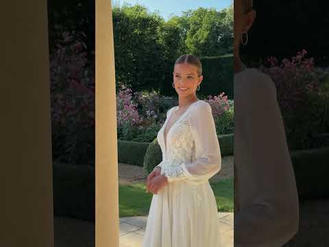 Kombinieren Sie das Kleid Soprona mit einer Hochsteckfrisur oder einem tiefen Dutt, um den Ausschnitt und die Zartheit der perlenbesetzten Ärmel hervorzuheben.