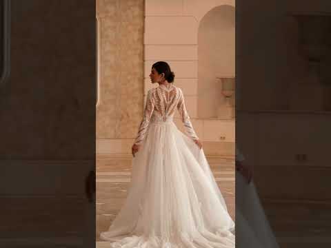 Die langen, eng anliegenden Ärmel aus perlenbesetztem Tüll verleihen dem Kleid eine königliche und raffinierte Note, während der hohe Kragen die majestätische Ausstrahlung unterstreicht, mit der der Kopf getragen wird.