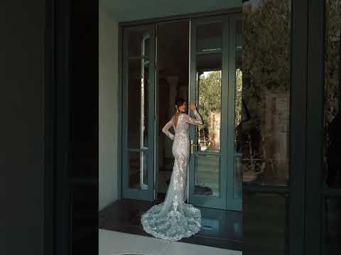 Das transparente Oberteil und der dezent gerundete Ausschnitt sorgen für eine perfekte Balance zwischen Sinnlichkeit und Eleganz, während die lange, bestickte Tüllschleppe die Majestät des Ganzen noch verstärkt.