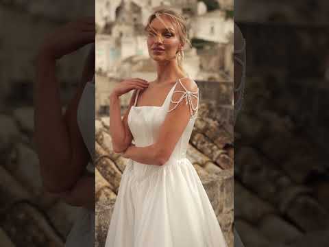 Das charakteristische Detail dieses Kleides: der abnehmbare Perlenschmuck an den Schultern , der zart in Ketten am Oberarm angeordnet ist. Er verleiht dem Kleid eine kostbare, strahlende und äußerst raffinierte Note – und bewahrt gleichzeitig die minimalistische Ästhetik.