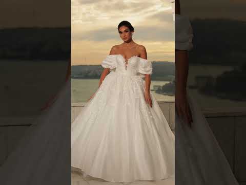 Lady Di Bride 1503 Hochzeitskleid – Prinzessinnenkleid aus Satinspitze mit geprägten Verzierungen, schulterfreie Puffärmel