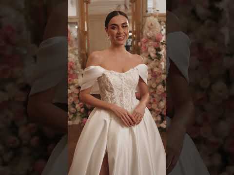 Der fließende Rock aus seidigem Satin öffnet sich mit einem eleganten Schlitz , der das Bein dezent enthüllt und dem Kleid einen Hauch sinnlicher Modernität verleiht. Ein Kleid für die selbstbewusste Braut, die raffinierte Details liebt und zeitlosen Glamour mit moderner Eleganz verbinden möchte.