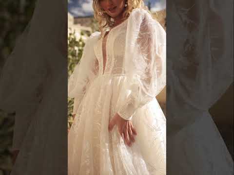 Les manches ballon amovibles, en dentelle transparente, apportent un style bohème et romantique. Elles permettent de transformer la robe au fil de la journée : manches pour la cérémonie, épaules dégagées pour la soirée. Une incision en transparence sous les bras accentue la légèreté de la silhouette et apporte un confort optimal.
