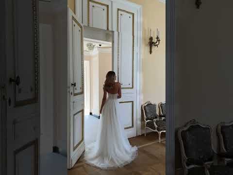 Sa coupe ligne A met en valeur la taille tout en offrant une jupe aérienne et légère, idéale pour un mariage romantique et raffiné.