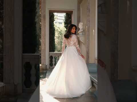 Le dos boutonné et transparent, fermé mais délicatement ajouré, apporte une touche de mystère et de raffinement. La traîne légère et vaporeuse ajoute une dimension majestueuse sans alourdir la silhouette — parfaite pour danser, marcher ou briller à chaque pas.