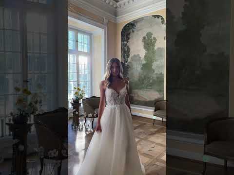 La jupe en tulle doux s’évase avec légèreté, accompagnant chaque pas d’un mouvement fluide et romantique, idéal pour une mariée à la recherche d’un équilibre entre sensualité et douceur.