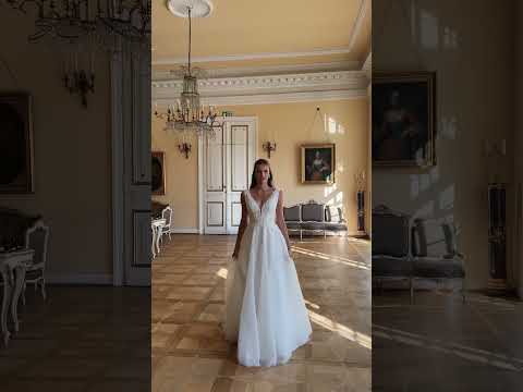 Le décolleté en V profond allonge le buste et souligne avec finesse la féminité de la mariée, tandis que les épaules dégagées apportent une touche moderne et sensuelle.