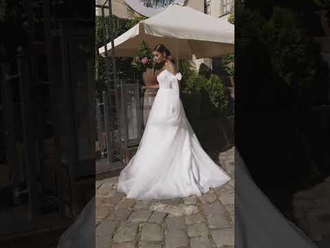 Son décolleté en V met subtilement en valeur le buste, tandis que ses fines bretelles apportent une touche de délicatesse et de féminité. Les manches en tulle tombant gracieusement sur les épaules, ornées de jolis nœuds, ajoutent une note romantique et aérienne. Cette combinaison harmonieuse crée un look à la fois moderne et poétique, idéal pour une mariée au charme naturel et raffiné.