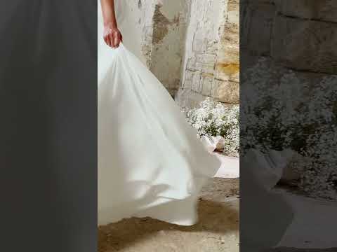 La taille est parfaitement marquée, laissant place à une jupe longue en mousseline fluide, légère et aérienne. La mousseline apporte un tombé naturel et une grande liberté de mouvement, idéale pour une cérémonie en extérieur, un mariage d’été ou une réception bohème chic. La jupe s’évase délicatement en ligne A et se termine par une traîne fluide, sobre et élégante.