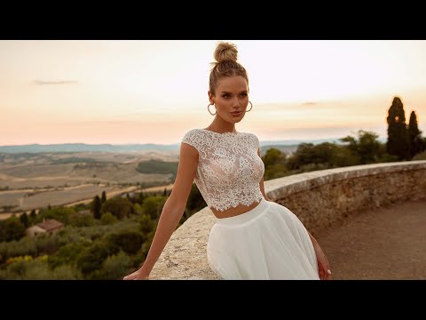 Ce modèle deux pièces, composé d’un haut en dentelle délicate et d’une jupe vaporeuse en tulle, incarne à la perfection l’esprit bohème chic et champêtre.