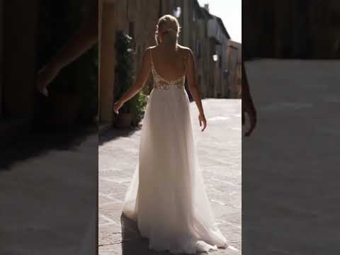 Ses sequins dissimulés dans la dentelle, ses bretelles perlées, et sa jupe aérienne en tulle créent un ensemble harmonieux, idéal pour un mariage en extérieur ou une cérémonie d’été.