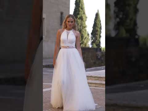 Son col halter met délicatement en valeur les épaules et le port de tête, tandis que le bustier en dentelle florale brodée de perles et petits sequins scintillants illumine le buste avec subtilité.