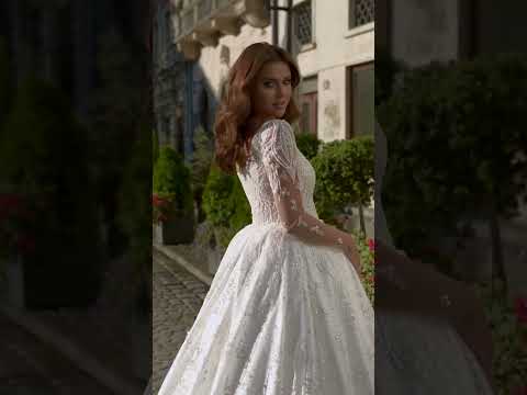 Le corsage à encolure élégante, légèrement arrondie, est sublimé par de longues manches en dentelle fine ornées de perles, de sequins et de cristaux, apportant une touche de romantisme et de sophistication intemporelle. Chaque détail, du travail minutieux des motifs à la finition parfaite, reflète le savoir-faire exceptionnel de la maison Lady Di Bride.