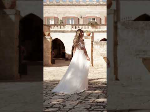 Sa dentelle mate au motif légèrement ethnique apporte une identité unique et très tendance. Le corsage haut, travaillé en transparence maîtrisée, dessine la silhouette avec douceur et élégance, tandis que les petites manches courtes en dentelle ajoutent une touche romantique et naturelle, idéale pour une cérémonie en extérieur.