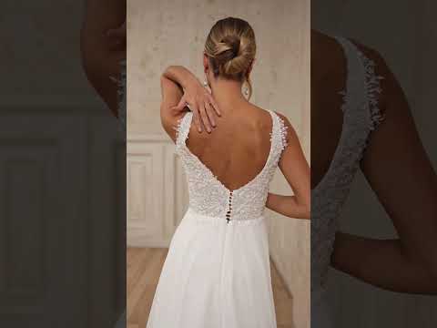 La silhouette A-line flatte toutes les morphologies : la taille est soulignée avant de s’ouvrir sur une jupe fluide en mousseline aérienne. Légère et vaporeuse, elle accompagne chaque pas avec grâce, idéale pour un mariage tout en mouvement et en naturel.