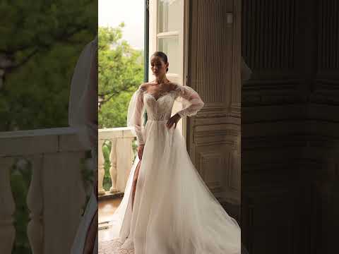 Les manches longues bouffantes en tulle transparent, resserrées aux poignets par de somptueuses finitions en dentelle brodée, apportent une aura royale et théâtrale, parfaite pour une mariée à la fois chic, moderne et majestueuse.