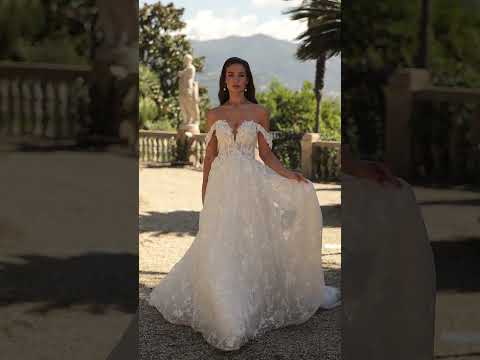 Son corsage en forme cœur aux épaules dénudées façon col bateau sublime le port de tête et la féminité du buste. Une fine couche de tulle pailleté légèrement transparente vient se poser sur la peau comme un voile de lumière, tandis que la dentelle florale rehaussée de sequins, perles et cristaux capte chaque rayon pour un effet étincelant et raffiné.