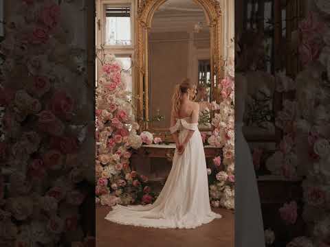 Son décolleté en cœur plongeant, sublimé par des épaules dénudées et des manches tombantes, met en valeur le buste avec délicatesse et élégance. Le corsage, entièrement brodé de perles, sequins et cristaux étincelants, capte la lumière à chaque mouvement et illumine la silhouette.
