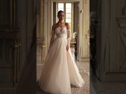 Les manches ballons amovibles en tulle transparent, se parent de motifs de dentelle au niveau des épaules pour une allure à la fois douce et sensuelle.