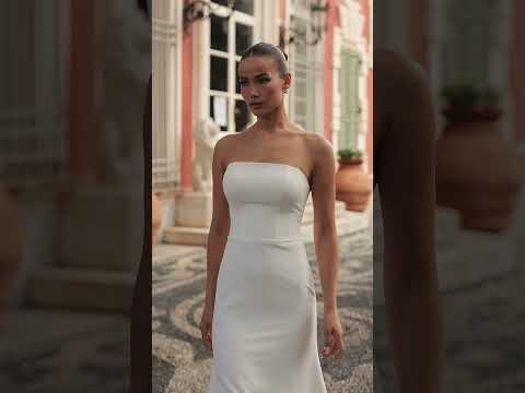 Cette robe 2 en 1 séduit par son élégance épurée et sa polyvalence raffinée. Son corsage droit effet col bateau se transforme grâce à une cape en tulle délicat, créant un effet aérien et romantique qui glisse avec légèreté jusqu’à la traîne. Portée sans la cape, la robe révèle une silhouette minimaliste et moderne, mettant en valeur la pureté du tissu et la grâce naturelle de la mariée.