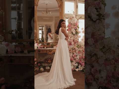 La jupe vaporeuse s’écoule avec légèreté en une traîne fluide, créant un mouvement aérien à chaque pas. C’est une robe à la beauté intemporelle, parfaite pour la mariée qui recherche un style romantique, épuré et plein de douceur, sublimé par des détails subtils et une allure naturellement gracieuse.