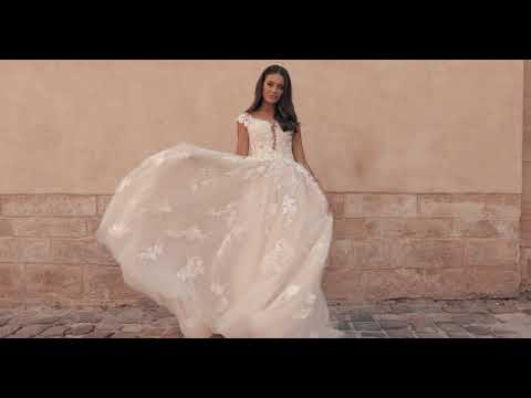 Le dos boutonné complète la silhouette avec une touche d’élégance intemporelle, renforçant le charme délicat de ce modèle. Sa jupe en tulle, ornée de motifs floraux brodés, se prolonge en une traîne légère idéale pour un mariage à la fois majestueux et confortable.