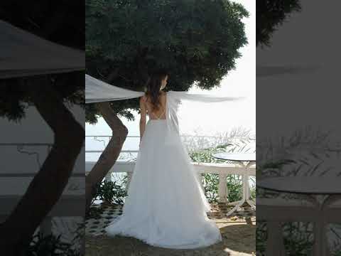Les bretelles effet cape en tulle apportent une touche aérienne et élégante, créant un effet spectaculaire lors de l’entrée de la mariée. La jupe volumineuse en tulle brillant se déploie en une traîne gracieuse, parfaite pour un mariage de conte de fées.