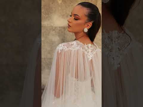 Sa silhouette princesse majestueuse impressionne par son volume, sublimé par une cape fluide en tulle amovible et perlée qui remplace le voile classique et transforme l’allure de la mariée en véritable reine.