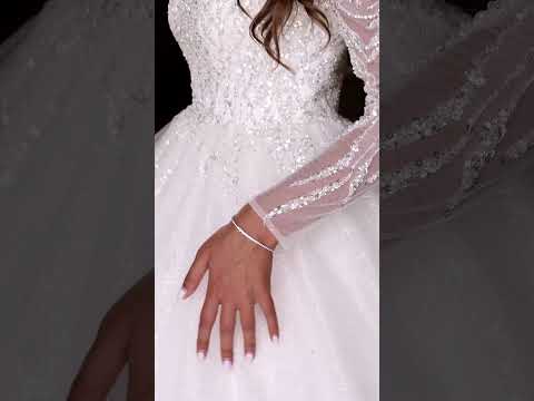 Le volume spectaculaire de sa jupe princesse étincelante, confectionnée dans un tissu scintillant, offre une silhouette féérique digne des plus beaux contes de fées. La traîne fluide qui s’étend à l’arrière ajoute une dimension majestueuse à chaque pas.