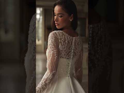 Dans le dos, une fermeture élégante avec une ligne de boutons ajoute une finition sophistiquée et classique. La jupe fluide s’accompagne d’une traîne royale, idéale pour créer des photos inoubliables et un effet grandiose à l’église comme en réception.