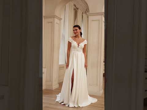 Robe de mariée Lady Di Bride 1231 – Satin A-line élégant avec fleurs appliquées et fente, col bateau