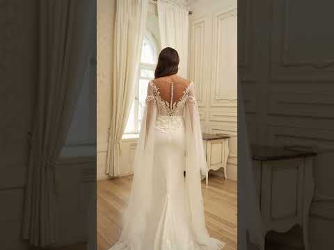 Les manches cape en tulle transparent brodées de dentelle apportent légèreté et romantisme. Elles sont détachables, permettant de transformer le look entre la cérémonie et la soirée.
