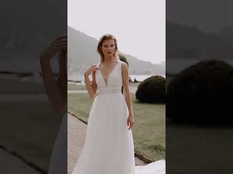 Le corsage ajouré sous les bras révèle subtilement la peau pour un effet raffiné et moderne, tandis que le dos lacé ajoute une touche romantique et permet un ajustement idéal. La jupe sirène fluide et vaporeuse se déploie en une traîne légère, créant un mouvement spectaculaire à chaque pas.