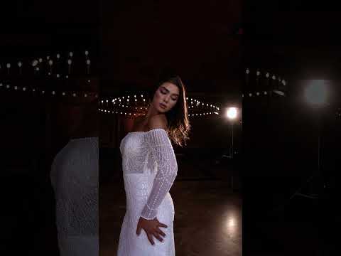 Sa coupe sirène ajustée épouse parfaitement les formes pour sublimer la silhouette avant de s’ouvrir subtilement au niveau de l’ourlet. Le design met en avant un décolleté droit à épaules dénudées, délicatement équilibré par de longues manches transparentes ornées de sequins scintillants.