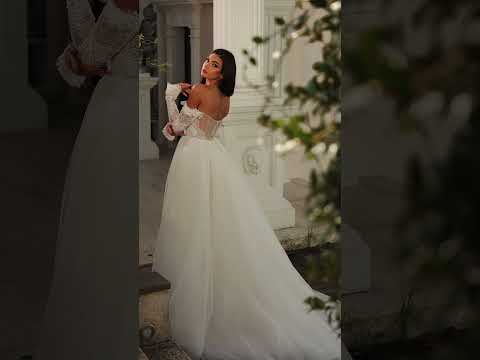 Le corsage bustier col bateau avec décolleté en cœur se combine à des manches longues épaules dénudées en dentelle fine, apportant romantisme et élégance.